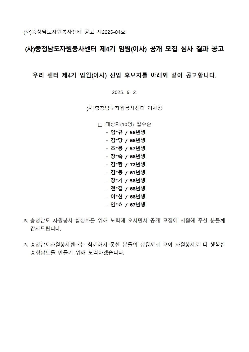 공지 (사)충청남도자원봉사센터 제4기 임원(이사) 공개 모집 심사 결과 공고 작성일25-06-02 10:30 조회수 1,703 회 본문 (사)충청남도자원봉사센터 제4기 임원(이사) 공개 모집 심사 결과를 다음과 같이 공고합니다 목록